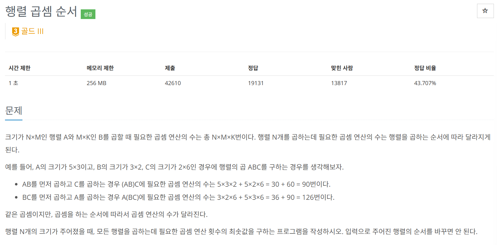 (์ด ๋, cost๋ ๋ ํ๋ ฌ dp[i][k]๊ณผ dp[k+1][j]์ ํ๋ ฌ ๊ณฑํ ์ฐ์ฐ ํ์๋ฅผ ๋ํ๋)