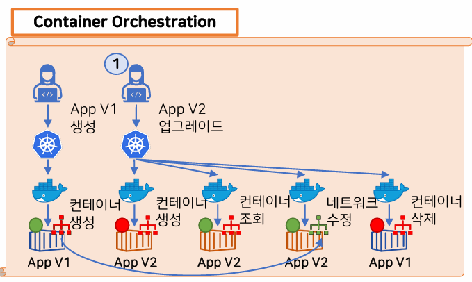 하지만, Kubernetes를 이용하면, 사용자는 단순히 K8s에 명령을 내리는 것으로 K8s가 컨테이너를 자동으로 관리