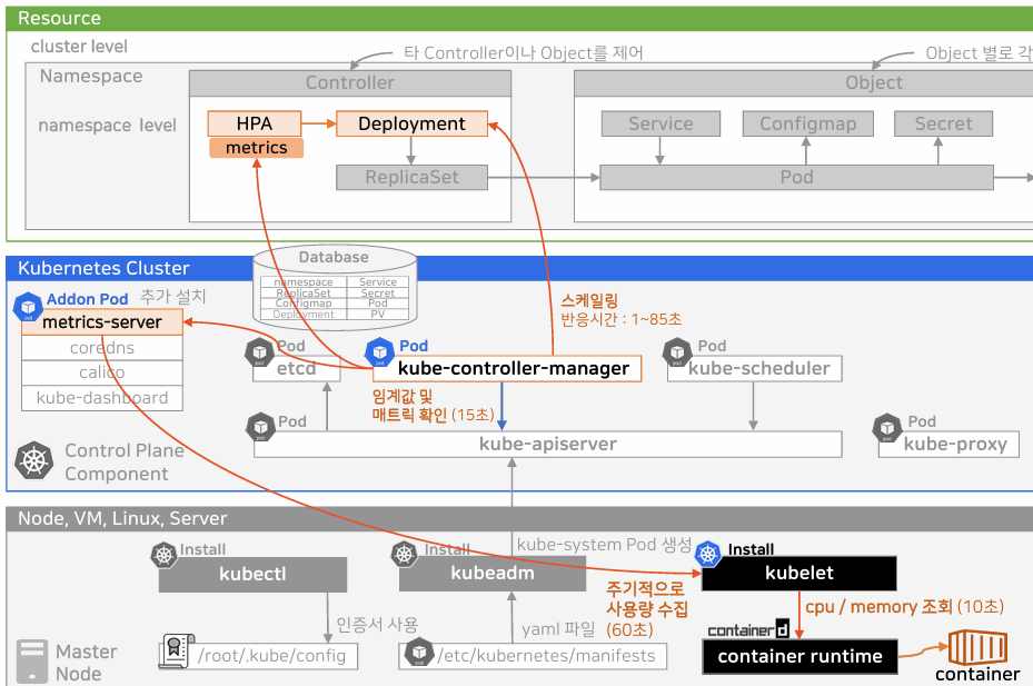 - kube-controller-manager는 metrics 정보를 kube-apiserver에 요청하면 metrics-server에서 가져와 전달해주면, 현재 metrics 값과 HPA에 정의된 목표 metrics 값을 비교하여 적정 Pod 수를 계산하고 현재 Pod 수와 다를 경우, replicas 필드를 업데이트 하도록 kube-apiserver에 요청하여 etcd에 저장