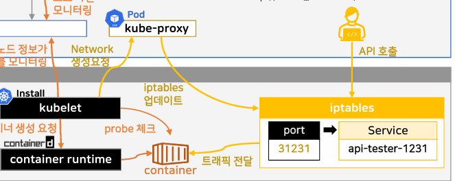 - kube-proxy는 iptables에 Service에서 정의된 port로 트래픽이 들어오면 Service로 갈 수 있도록 매핑 룰을 업데이트