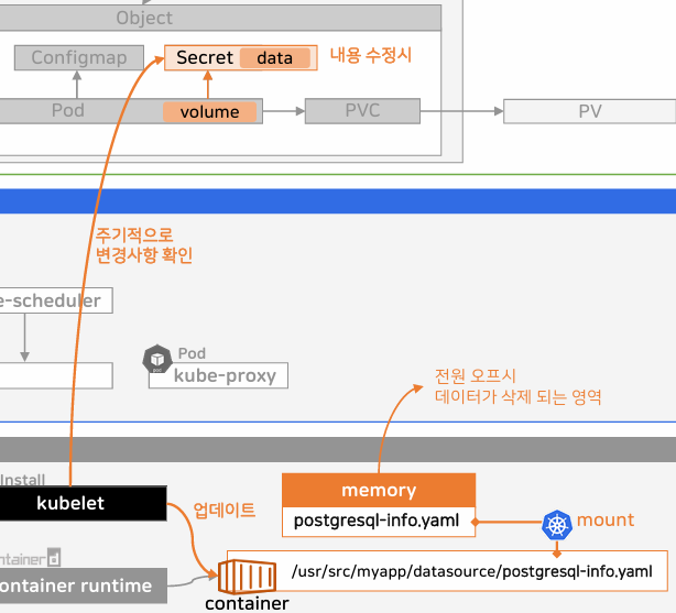 - Container 내부의 Secret 파일은 Node의 Memory 영역에 마운팅 됨
