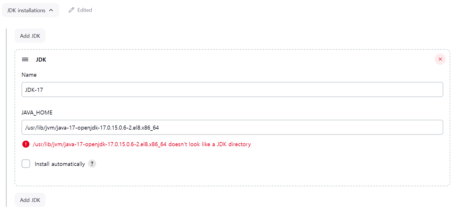/usr/lib/jvm/java-17-openjdk-17.0.15.0.6-2.el8.x86_64/bin/java - 해결: 위 주소에서 '/bin/java' 를 제외하고 설정
