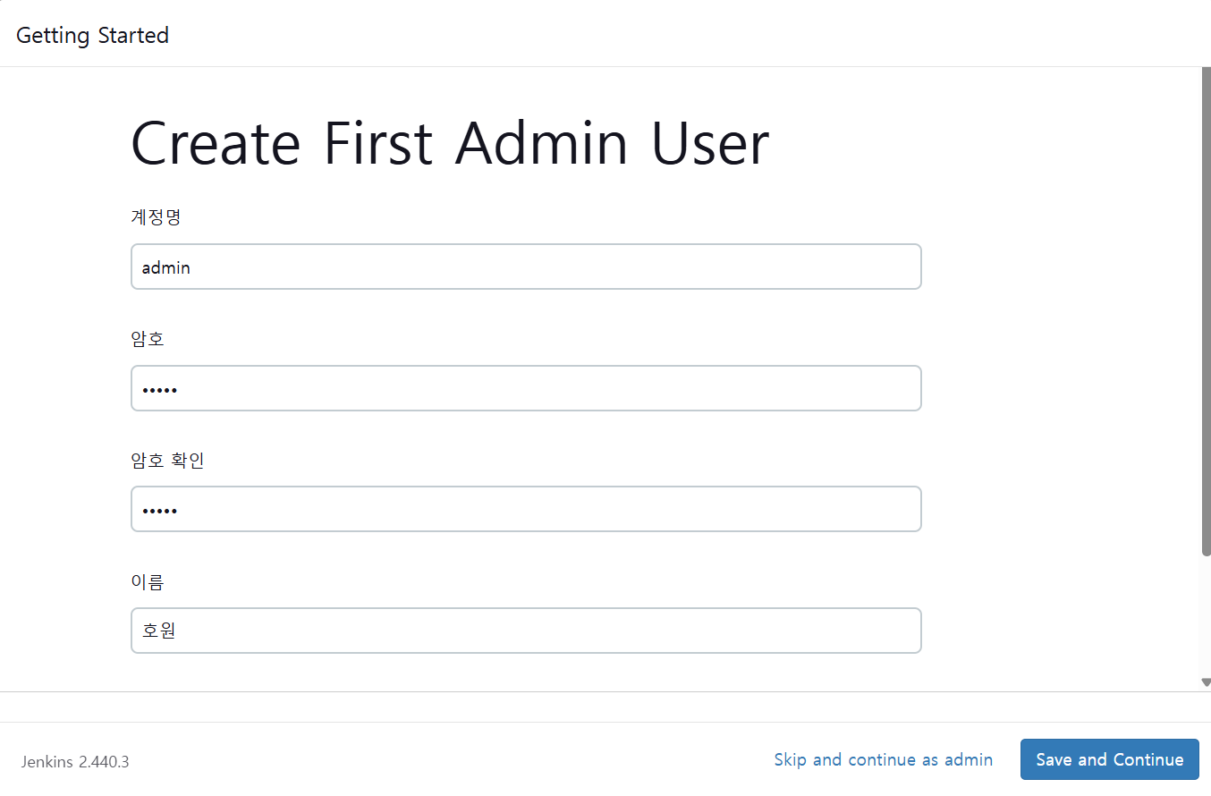 - 권장하는 플러그인 설치를 모두 마치고, Admin 사용자 생성