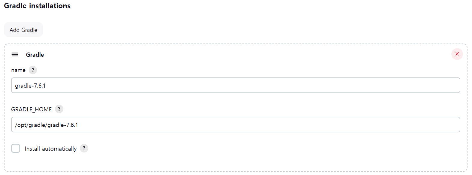 Gradle Installations > Install automatically(해제) > 수동으로 설치한 Gradle 경로를 지정