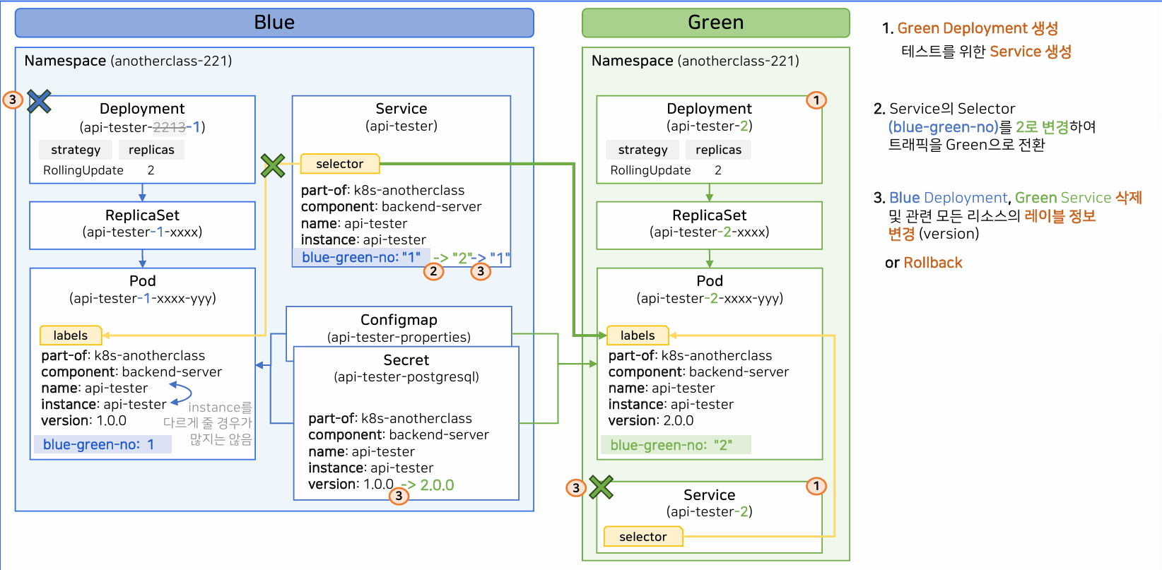 - 테스트가 완료되고 배포를 계속할 경우, Blue의 Deployment와 Green의 Service는 삭제되고 기존 Resources의 관련 정보는 모두 Green의 정보로 변경