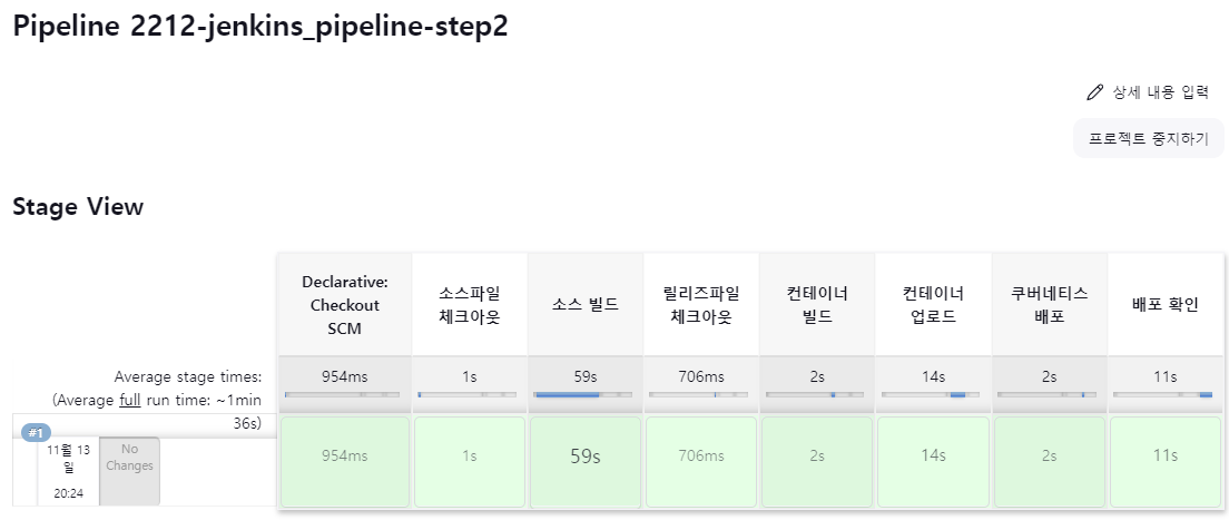 - Pipeline을 빌드하게 되면, 아래와 같이 각 단계 별로 진행도를 가시적으로 확인할 수 있다.