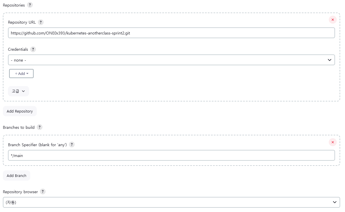 // Build 진행 할 소스의 Repo와 브랜치를 지정