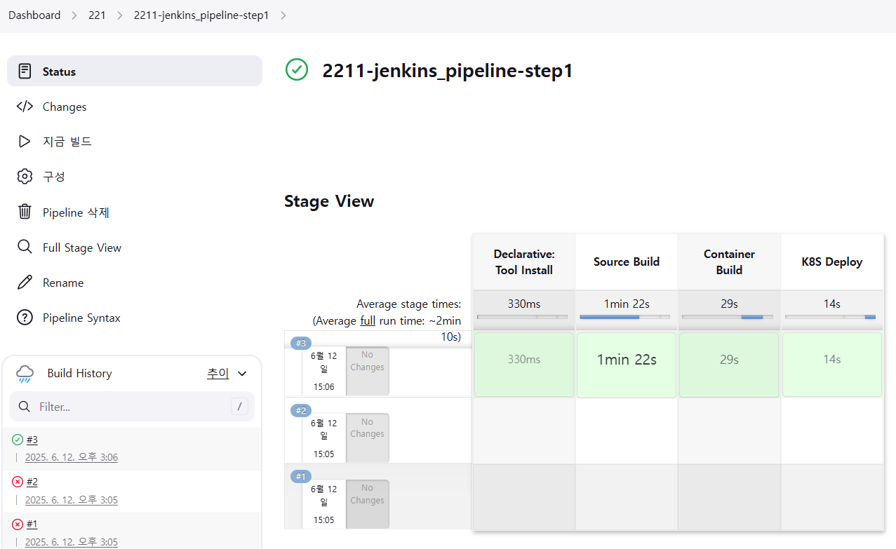 - 빌드 시, 똑같이 Jenkinsfile에 정의된 Stages에 따라 표시되는 것을 확인