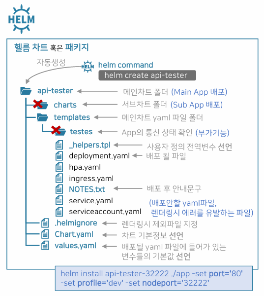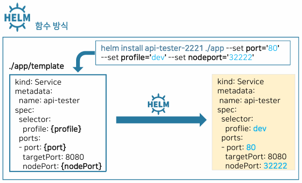 - values.yaml: 배포된 YAML에 사용될 변수들의 정보 선언
