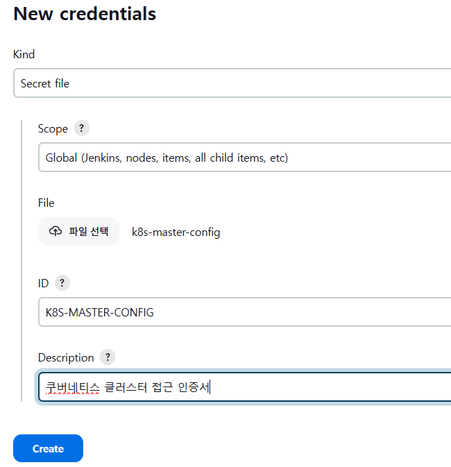 - Kubernetes config 파일을 Jenkins Credentials에 등록