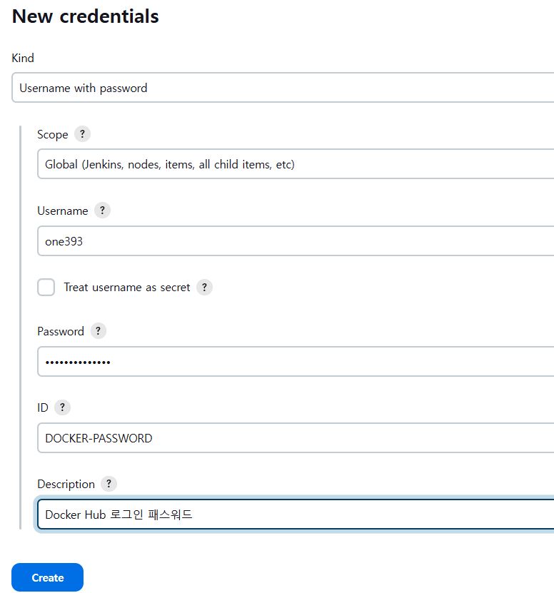 - Docker 인증 정보를 Jenkins Credentials에 등록