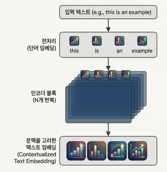 입력 텍스트를 받아 문맥 정보를 담은 텍스트 임베딩(벡터의 집합)로 변환한다.