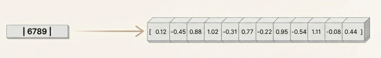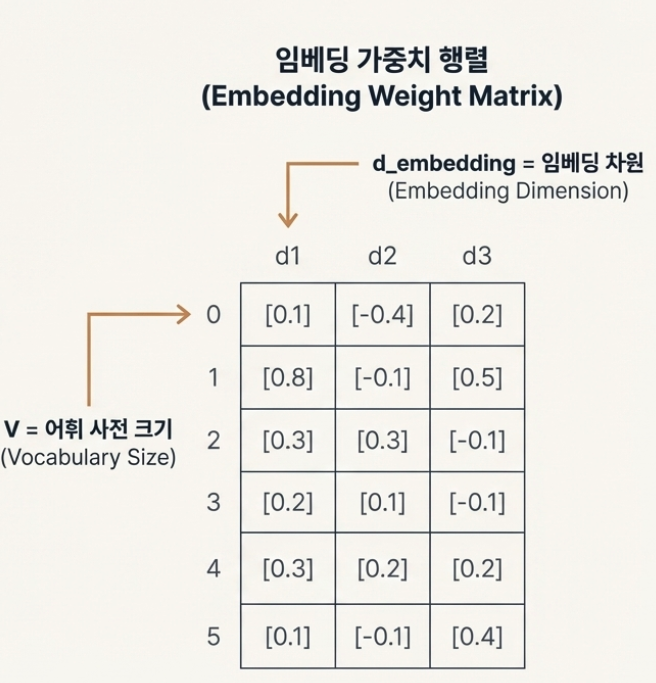 (즉, 토큰 ID가 '2'라면, 행렬의 '두 번째 행'에 있는 벡터를 조회(Lookup)하여 다음 Layer로 전달)
