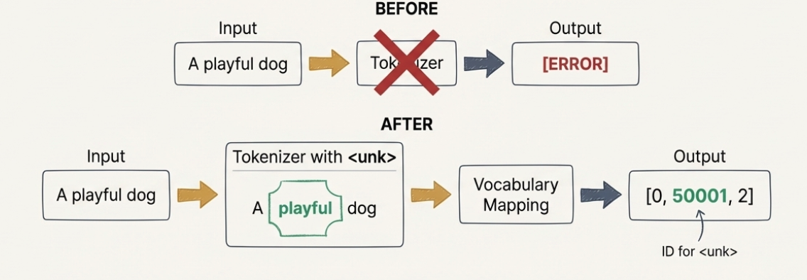처리 과정을 중단하지 않고 계속 진행할 수 있도록 하는 안전장치 역할로, 사전에 없는 단어는 Unknown 토큰이 그 자리를 채운다.