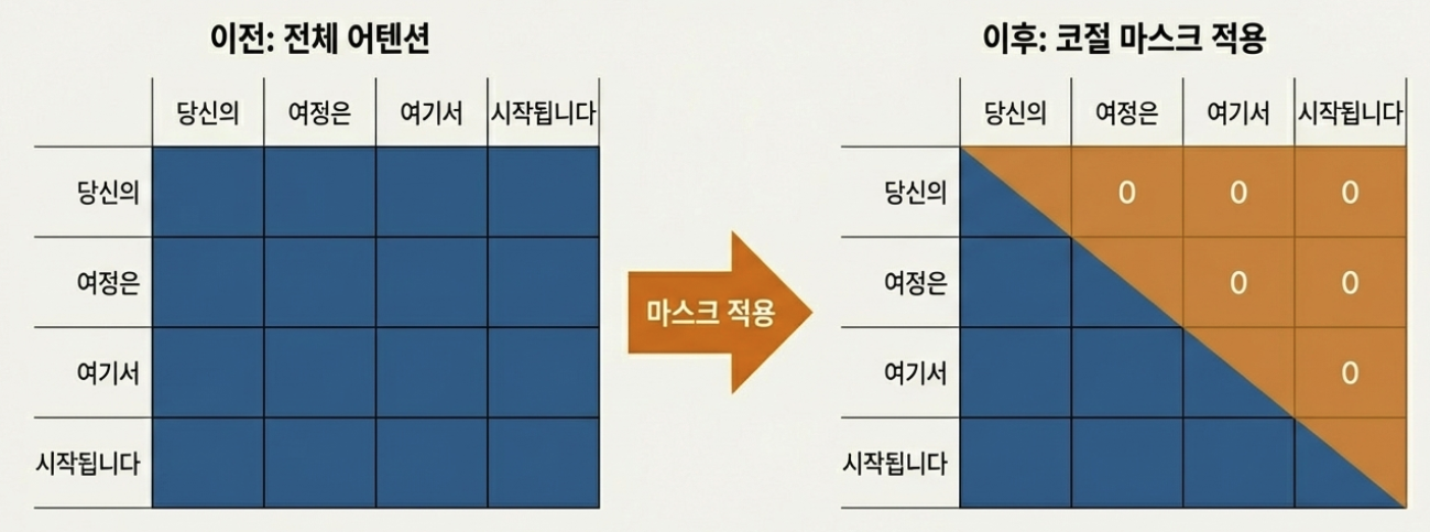 때문에, 이 문제를 해결하기 위해 마스크를 적용하여, 현재 토큰 위치 이후에 오는 모든 토큰들의 어텐션 점수를 강제로 0으로 만든다.